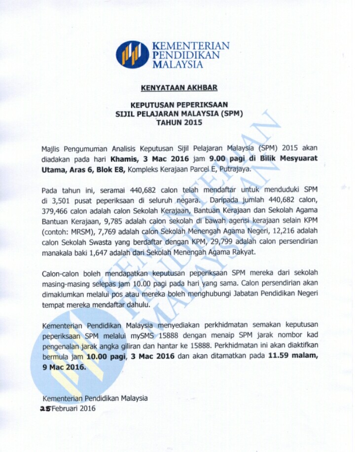 Hebahan Kenyataan Akhbar Kementerian Pendidikan Malaysia Kpm Keputusan Spm 2015 Saifunnajjah